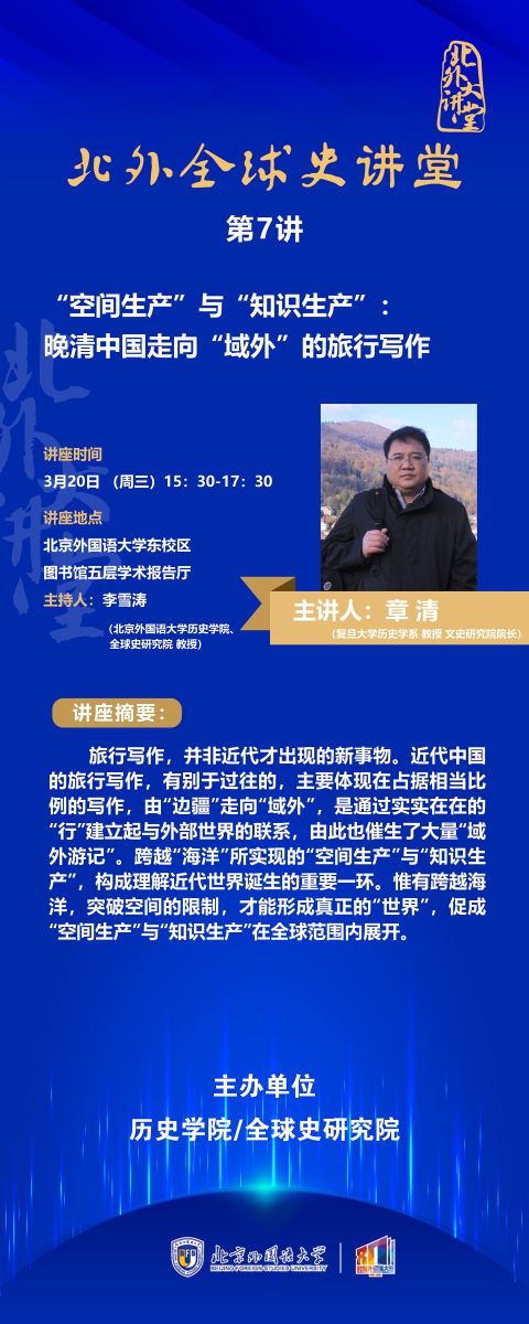 2024年3月20日 在北外图书馆学术报告厅成功举办了《“空间生产”与“知识生产”:晚清中国走向“域外”的旅行写作》的讲座。星空XK官网院长李雪涛教授主持了这场讲座, 首先简单介绍了复旦大学历史学系、文史研究院院长章清教授研究领域及成果,然后大家倾听了章清教授精彩的报告, 最后的互动环节,与会者积极参与讨论,章清教授给予北外的学子们掌握好外语在今后的历史研究领域发挥更大的作用。
