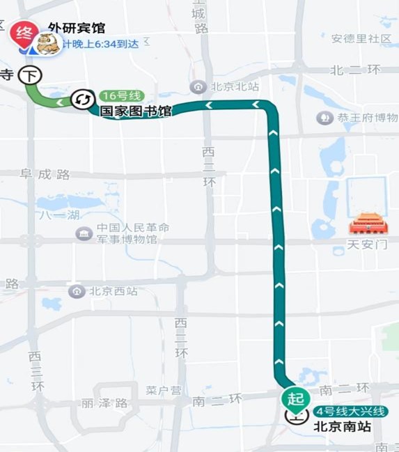 4.1若您从北京南站(高铁站)出发,可以搭乘地铁4号线北京南站安河桥北方向,在国家图书馆站下车,站内换乘16号线北安河方向,在万寿寺站(A西北口)下车,下车后向北直走进入西三环北路,前行即可到达外研宾馆。如家酒店位于外研宾馆北1公里处,步行十分钟可达。该路线用时约50分钟,线路如图1所示。