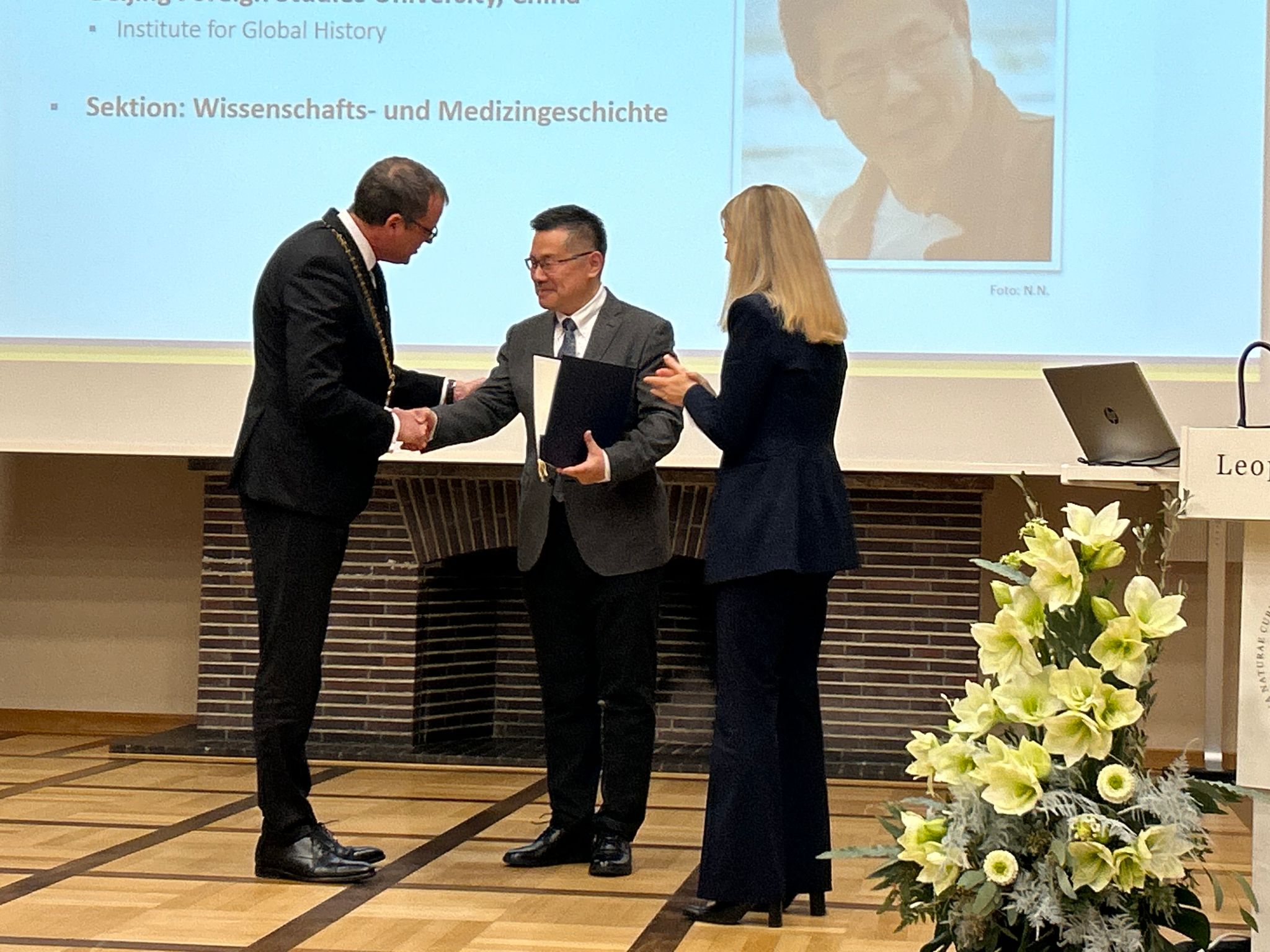 2023年11月23日,李雪涛教授在德国参加了在哈勒(Halle)的德国国家科学院总部举行的授勋和颁发院士证书的仪式。